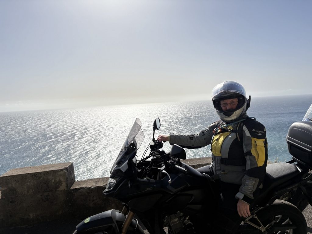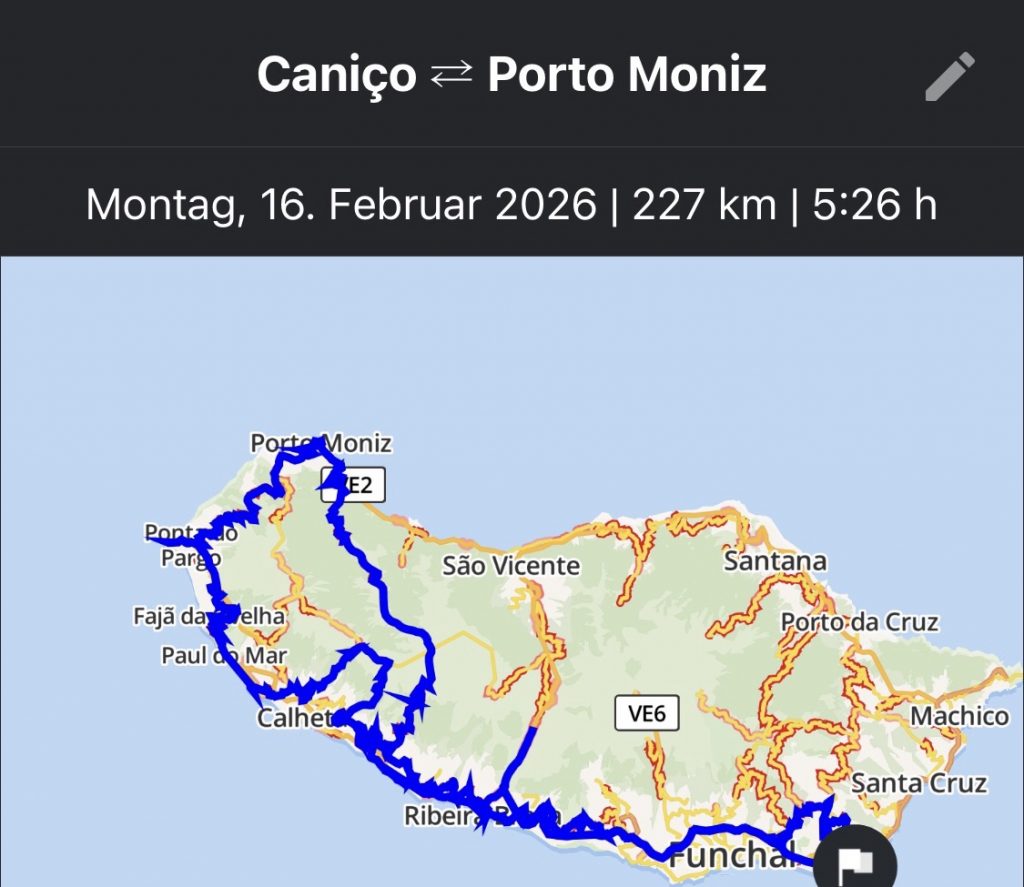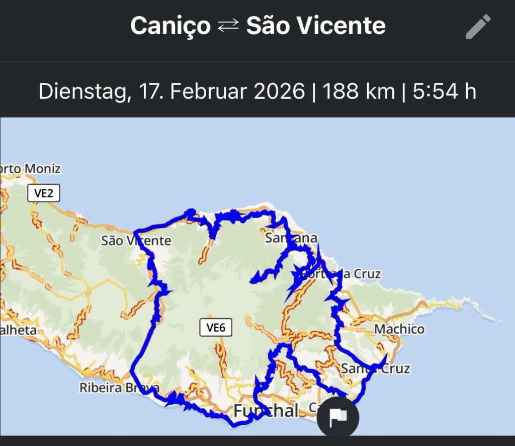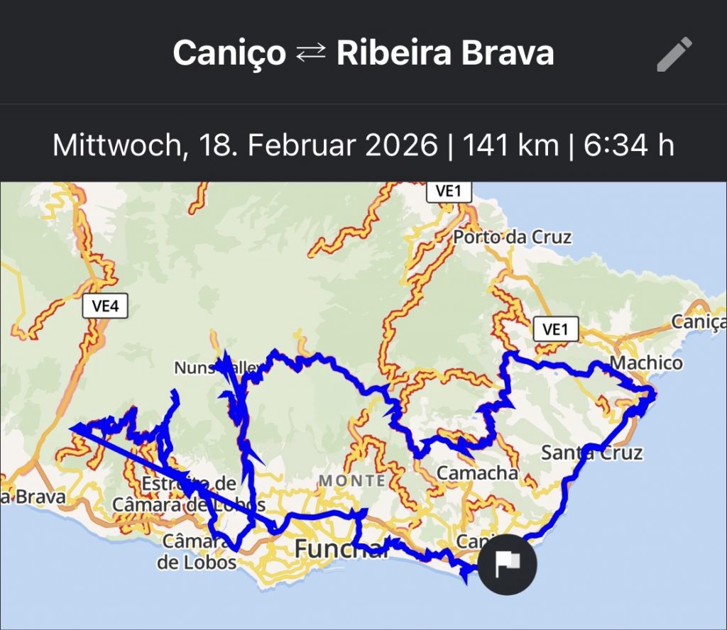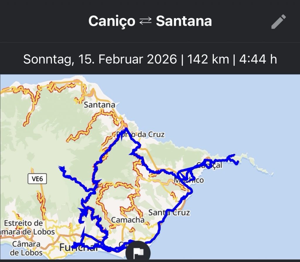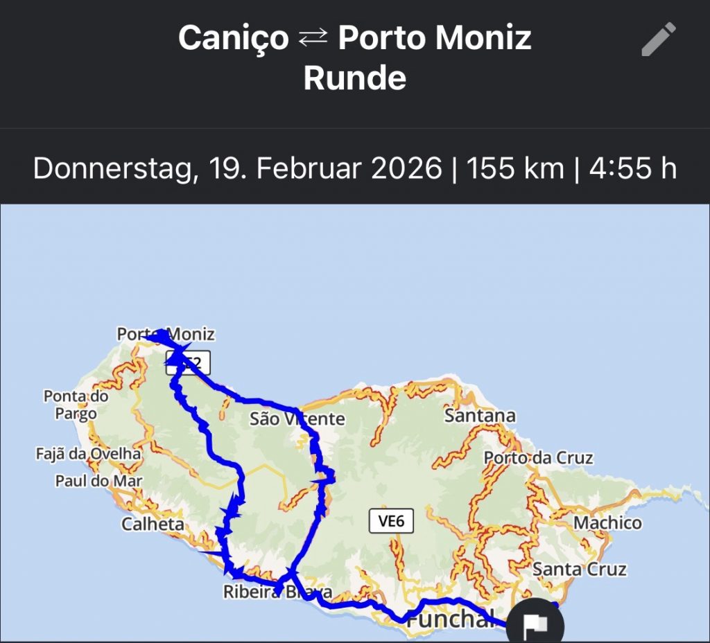 Am Ersten Tag in Caniço, einem Samstag im Februar, haben wir in der Sonne auf der Terrasse gechillt und sind nach dem Abendessen nach Funchal zum Karnevalsumzug reingefahren. Der Umzug war grandios, allerdings konnten wir irgendwann nicht mehr stehen und erwarteten die Rückfahrt um 23Uhr sehnsüchtig. Die Nacht war dann kurz, am Sonntag war wie jeden Tag Frühstück um 8Uhr angesagt und Abfahrt dann um 9Uhr. Heute, am Sonntag, fuhren uns drei Taxis in die Motorradvermietung. Alle Motorräder standen mit unseren Namen vorbeteitet für uns bereit. Dann begann die Tagestour. Erst zum Monte, dann zum Pico der Areeiro, zum Ribeiro Frio, nach Machico und Canical, den östlichsten Punkt auf Madeira, ehe wir über Santa Cruz auf die Autobahn heimwärts schwenken.